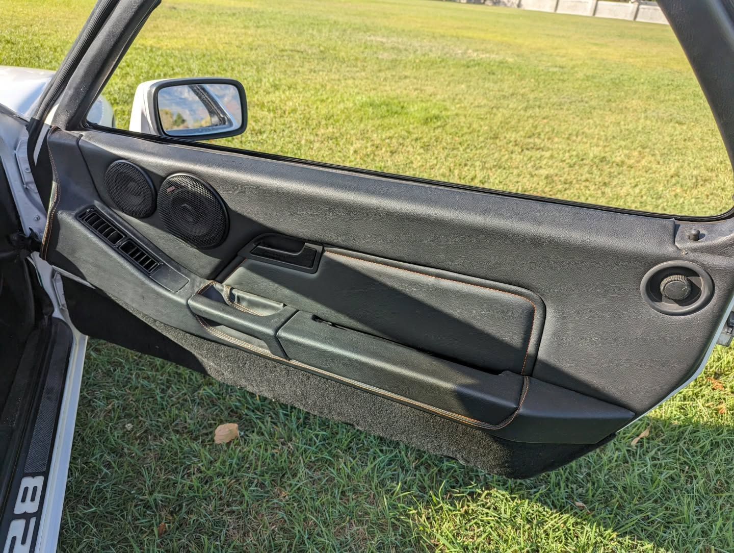 The cabin is fully reupholstered in black leather with orange stitching from Classic 9, paired with a new carpet kit. Audio upgrades include a vintage-look Blaupunkt Bremen SQR 46 DAB head unit with Bluetooth, amp, and Focal speakers. All gauges and the odometer function properly, and the gauge pod has been rebuilt. New switches installed for seats, windows, sunroof, and rear wiper.